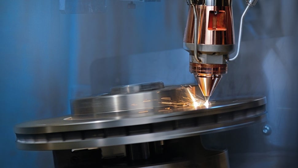 Beschichtung einer PKW-Bremsscheibe: Am Fraunhofer-Institut für Lasertechnik wird das Laserauftragschweißen seit drei Jahrzehnten intensiv erforscht.